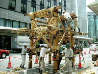 月鉾の「真柱」が立ち上がる瞬間は感動です。鉾の土台を横にして「真柱」をはめ込み、テコと滑車の原理を使って少しづつ建てていく伝統の手法は見事です。(写真1~4)