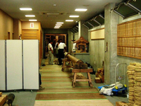 四条通りでは長刀鉾が鉾建てを開始、保存会の倉庫には「真柱」も準備。新町通りには放下鉾、「真柱」はそばでスタンバイ。狭い南北通りはこの日から通行止めとなります。