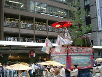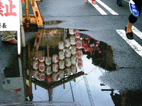 ★山鉾巡行――巡行の写真は巷にあふれています。時間の関係で巡行は追えませんが、一昨年の雨の中の巡行写真から数枚掲載(写真15)。先頭の長刀鉾が新町御池に到着すると、大役を終えたお稚児さんが鉾から降りて巡行の完了です。来年は「辻回し」に注目します。