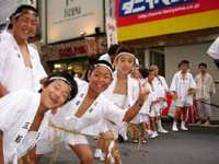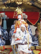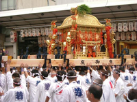 巡行を終えた夕刻、八坂神社から三基の神輿が出発します。これが「神幸祭」で、一週間後八坂神社に戻る儀式が「還幸祭」です。「錦」「三若」「四若」…三つの「神輿会」による三基の神輿が市内を巡行。こども神輿もでます。クライマックスは祇園石段下に集結した三基の神輿の「差し上げ」。最後は八坂神社に戻ります。(写真17~18)