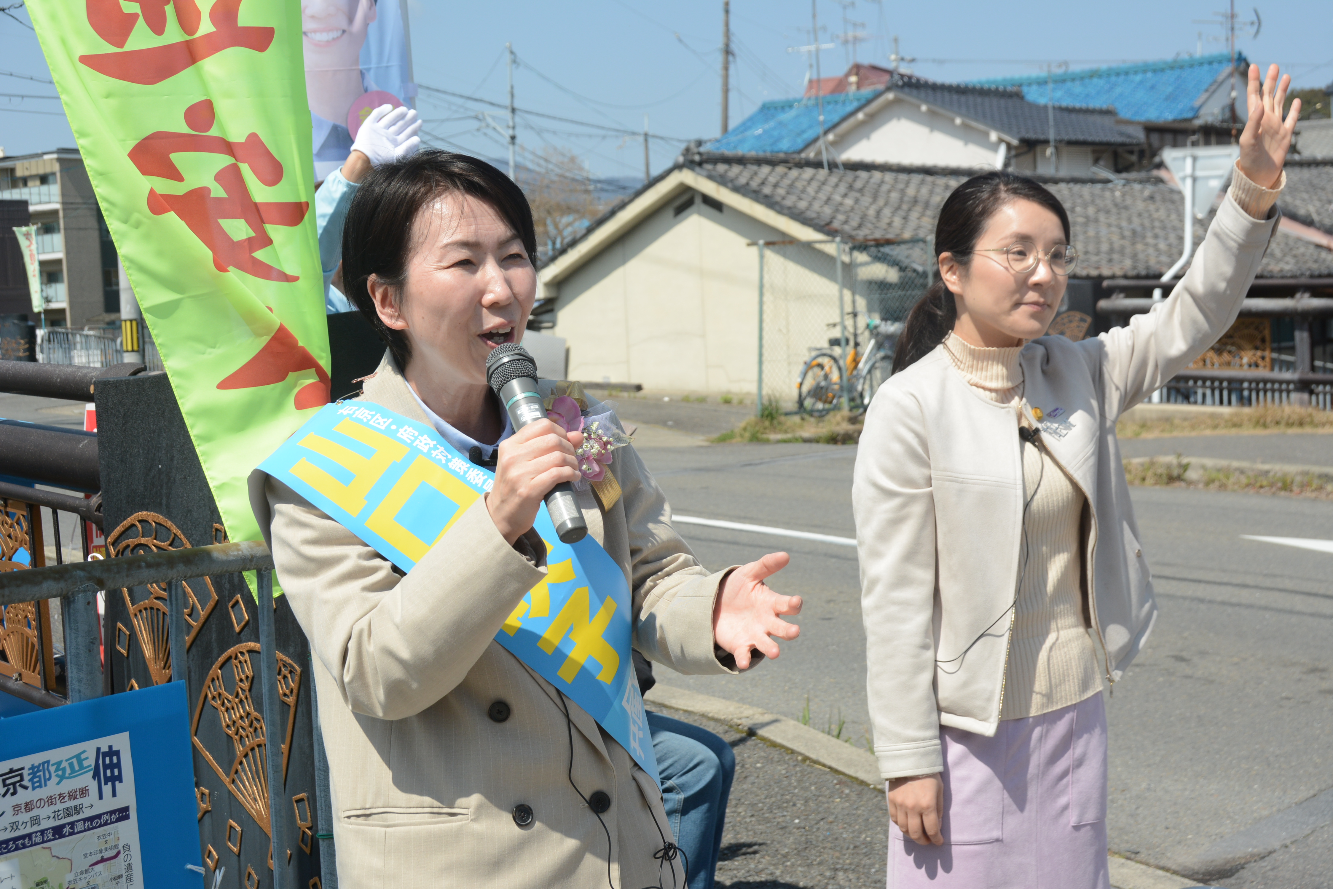立候補表明後、2000 人超と対話。子ども医療費 18歳まで無料化、学校給食無償化、国保料引き下げ、 補聴器助成拡充など公約。 右京区の地下を通過するこことになる北陸新幹線延伸計画の中止も掲げます。