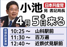 京都府議選・京都市議選が最終盤を迎える5日(金)、小池晃書記局長・参議院議員が京都入り。京都市内3カ所で日本共産党の躍進・勝利を訴えます。 ぜひ、お聞きください。 ◆午前10時25分~10時55分 ―― 山科駅前 【弁 … 続きを読む 4/5 小池晃・書記局長来る!