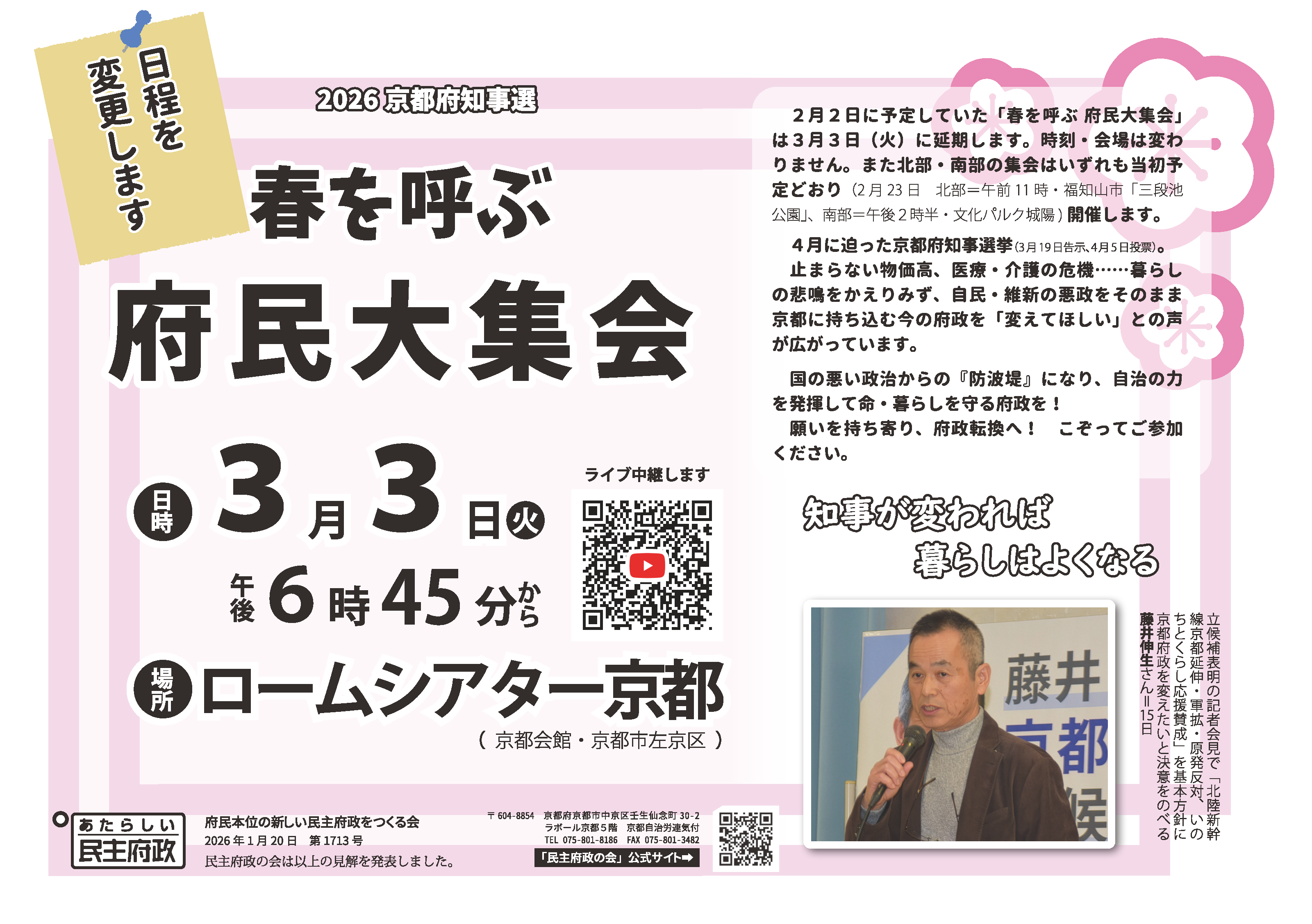 2026.1.17(土) 「春を呼ぶ 府民大集会」@ロームシアタ京都が延期されます 衆議院の解散・総選挙をめぐる事情で、2月2日に予定していた集会が3月3日(火)に延期されます。 時刻・場所は変更ありません。 ●3月3日(火)18:45~ ロームシアター京都(京都会館・京都市左京区) 北部・南部集 ..