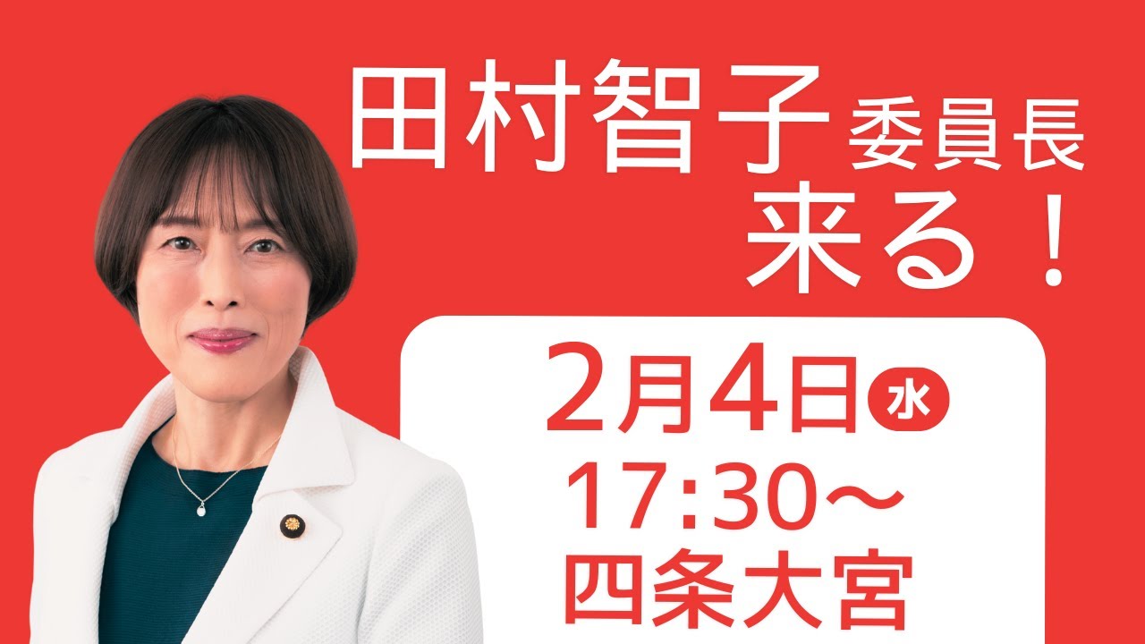 2026.1.30(金) 2月4日(水)【街頭演説】田村智子委員長@四条大宮 田村智子委員長がみなさんに訴えます。ぜひお越し下さい。 🕜2月4日(土)17:30~ 🚩四条大宮(京都市下京区) 堀川あきこ・比例代表候補が、かまの敏徳・京都1区、吉田幸一・京都4区の両小 ..