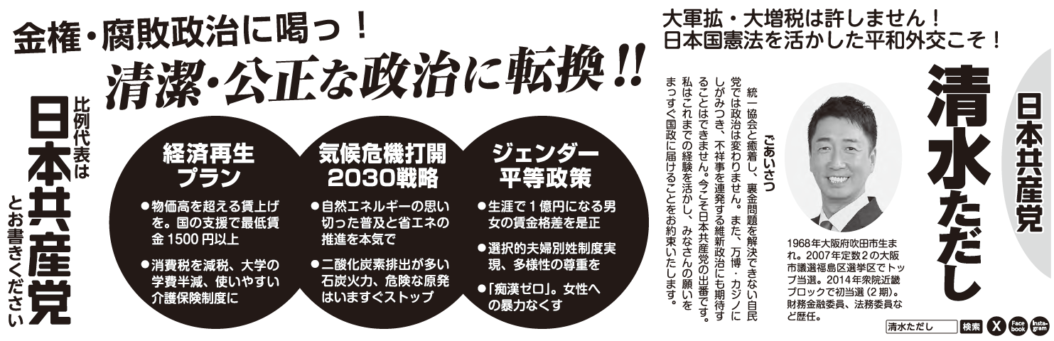 「普通に働いて誰もが幸せに暮らせる社会」「戦争は許さない」が原点。大軍拡・大増税ストップ、新しい政治へ全力。