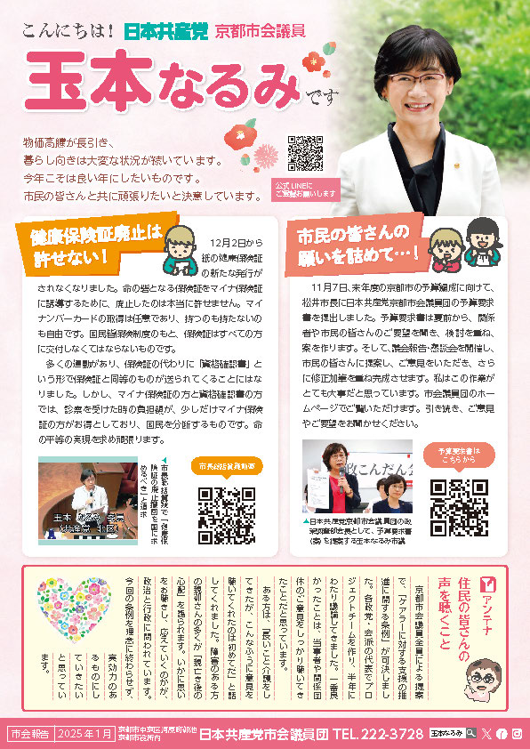 北健康守る会・上賀茂健康友の会・かも川生活と健康守る会顧問、新日本婦人の会北支部委員。