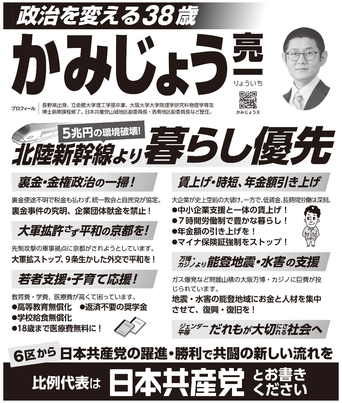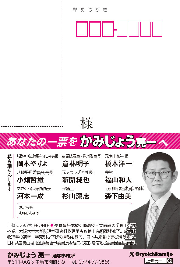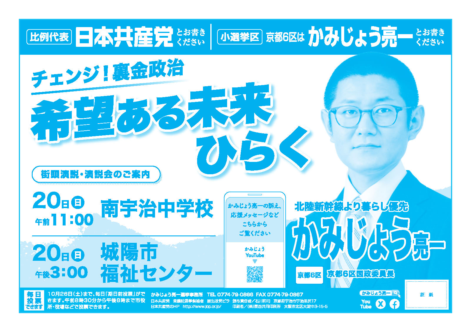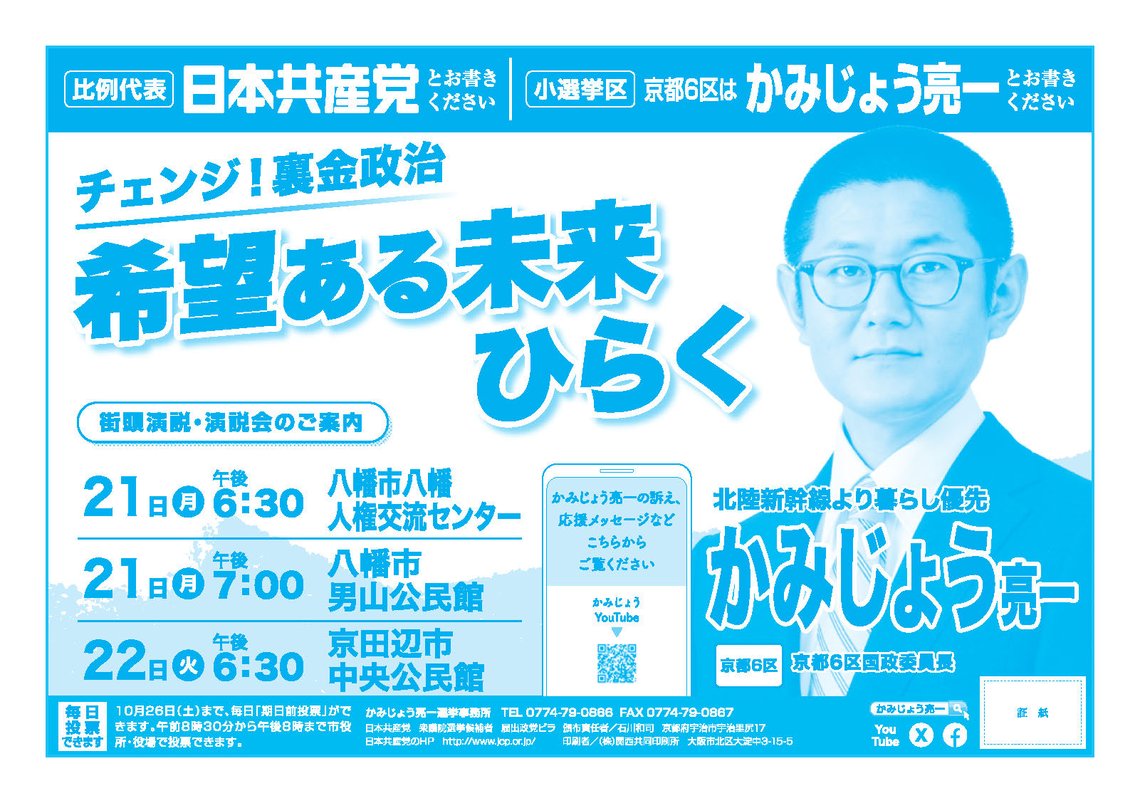 【衆院・京都6区】宇治市、城陽市、八幡市、京田辺市、木津川市、久御山町、井手町、宇治田原町、笠置町、和束町、精華町、南山城村
