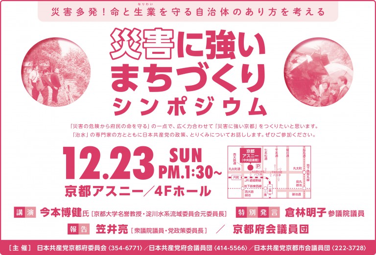 災害が多発する近年、命と生業(なりわい)を守る自治体のあり方を考えようと、日本共産党京都府委員会・府会議団・京都市会議員団の共催で「災害に強いまちづくりシンポジウム」を開催します。 「災害の危険から府民の命を守る」の一 … 続きを読む 12/23「災害に強いまちづくりシンポジウム」