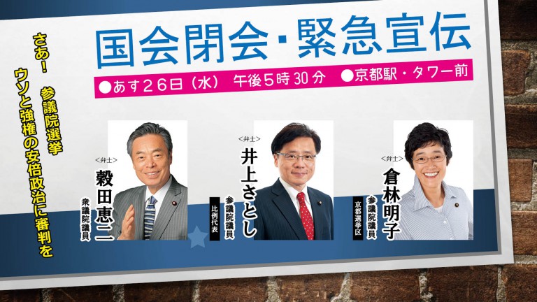 あす26日(水)は国会閉会。倉林・井上・穀田の3国会議員が京都へただちに帰還。街頭演説おこないます。 ◆とき:26日午後5時30分~ ◆場所:京都タワー前