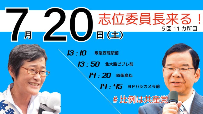 参院選・最終日、志位委員長が再び京都入り! 当落線上の大激戦!比例第一党・倉林明子の再選を必ず!――――と4カ所で訴えます。 ぜひ、お立ち寄りください。 ・13:10~ 阪急西院駅前(右京区) ・13:50~ 北大路ビブ … 続きを読む 【街頭演説】志位和夫委員長4カ所で / 最終日・20日