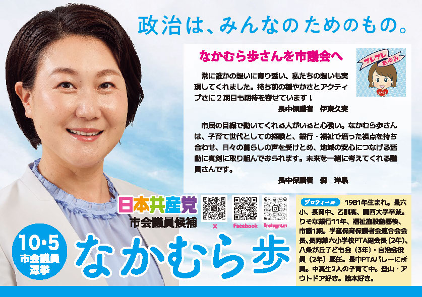 1981年生まれ。長六小、長岡中、乙訓高、関西大学卒業。りそな銀行11年、福祉施設勤務後、市議1期。学童保育保護者会連合会会長、長岡第六小学校PTA副会長(2年)、八条が丘子ども会(3年)・自治会役員(2年)歴任。長中PTAバレーに所属。中高生2人の子育て中。登山・アウトドア好き。絵本好き。