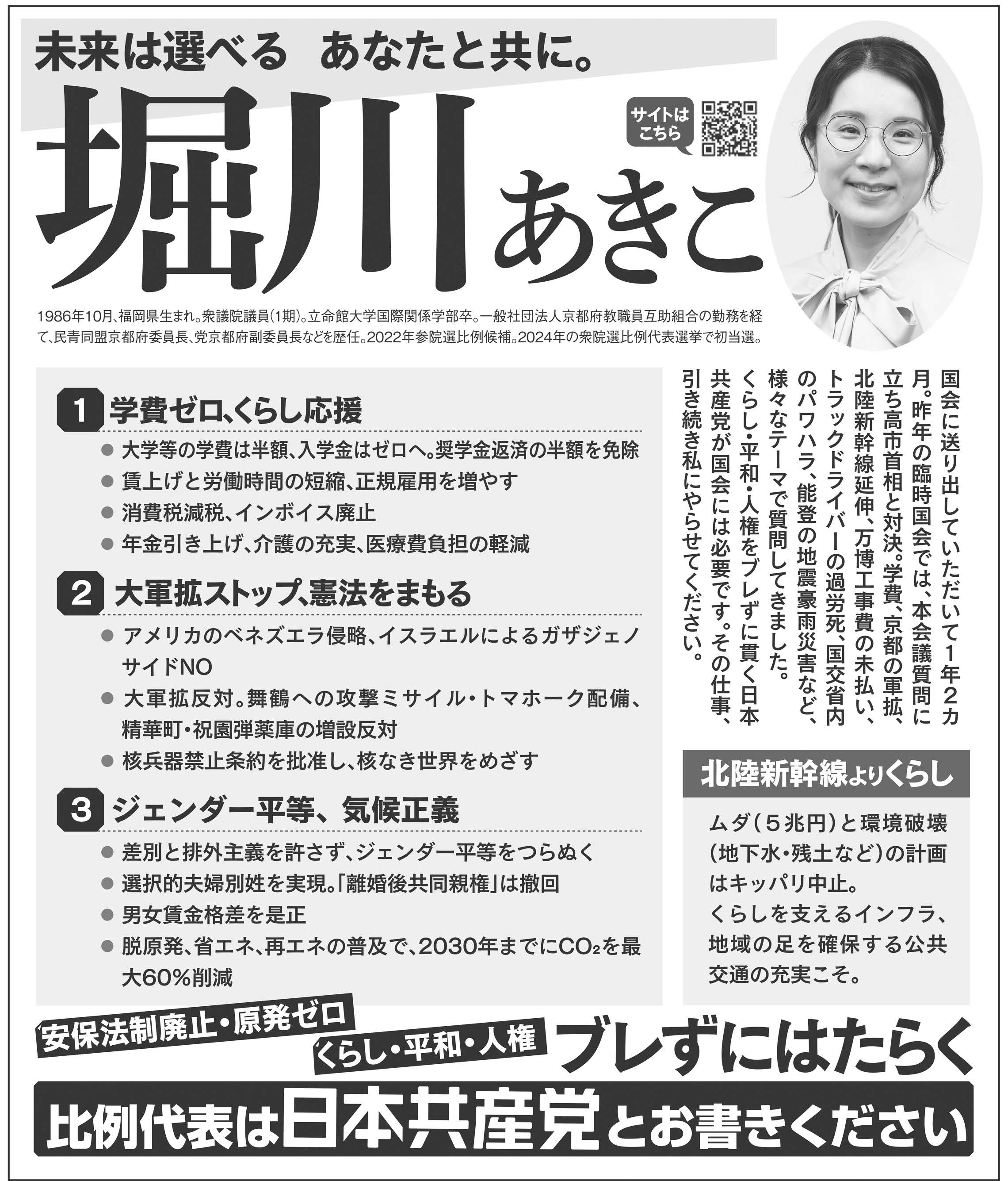 ●1986年福岡県生まれ。衆議院議員(1期)。立命館大学国際関係学部卒業。党民青同盟左京地区委員長。民青同盟京都府委員長。党京都府副委員長(2024年3月~25年3月)。立命館大学学生9条の会メンバー。京都府教職員互助組合労働組合執行委員。LDA(ローカルデモクラシーアクション)京都・事務局。2022年の参院選で比例代表から立候補。24年の衆議院選挙・比例代表選挙で初当選。