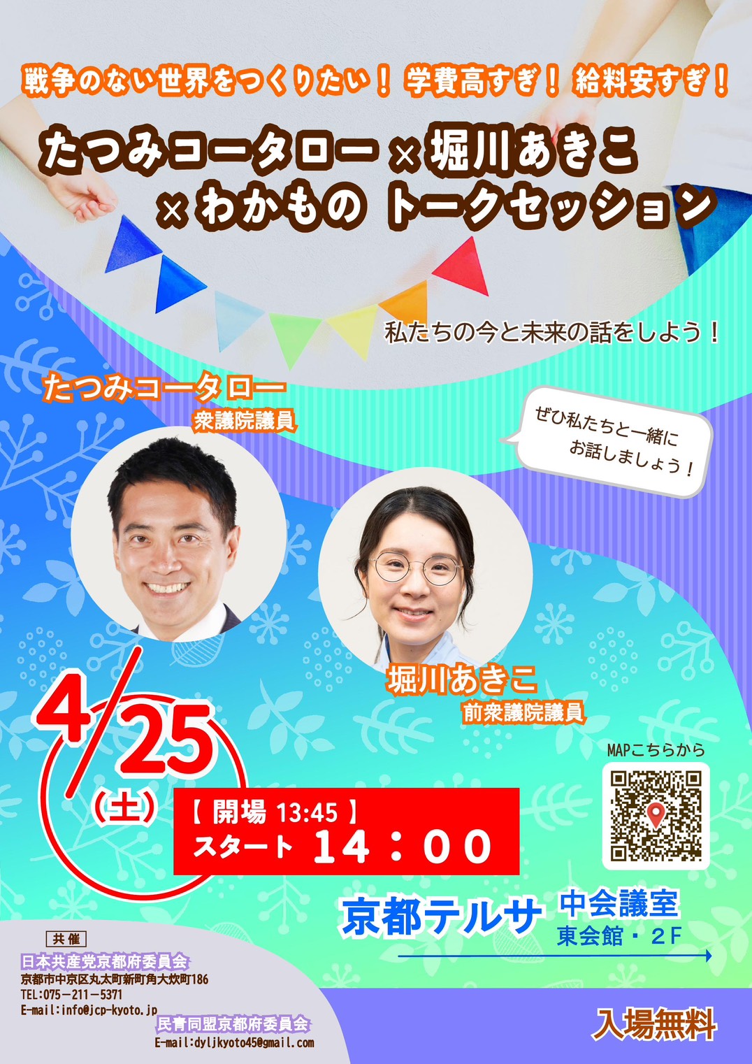 日本共産党のたつみコータロー衆議院議員と堀川あきこ前衆議院議員が、青年・学生のみなさんの思いをお聞きします!