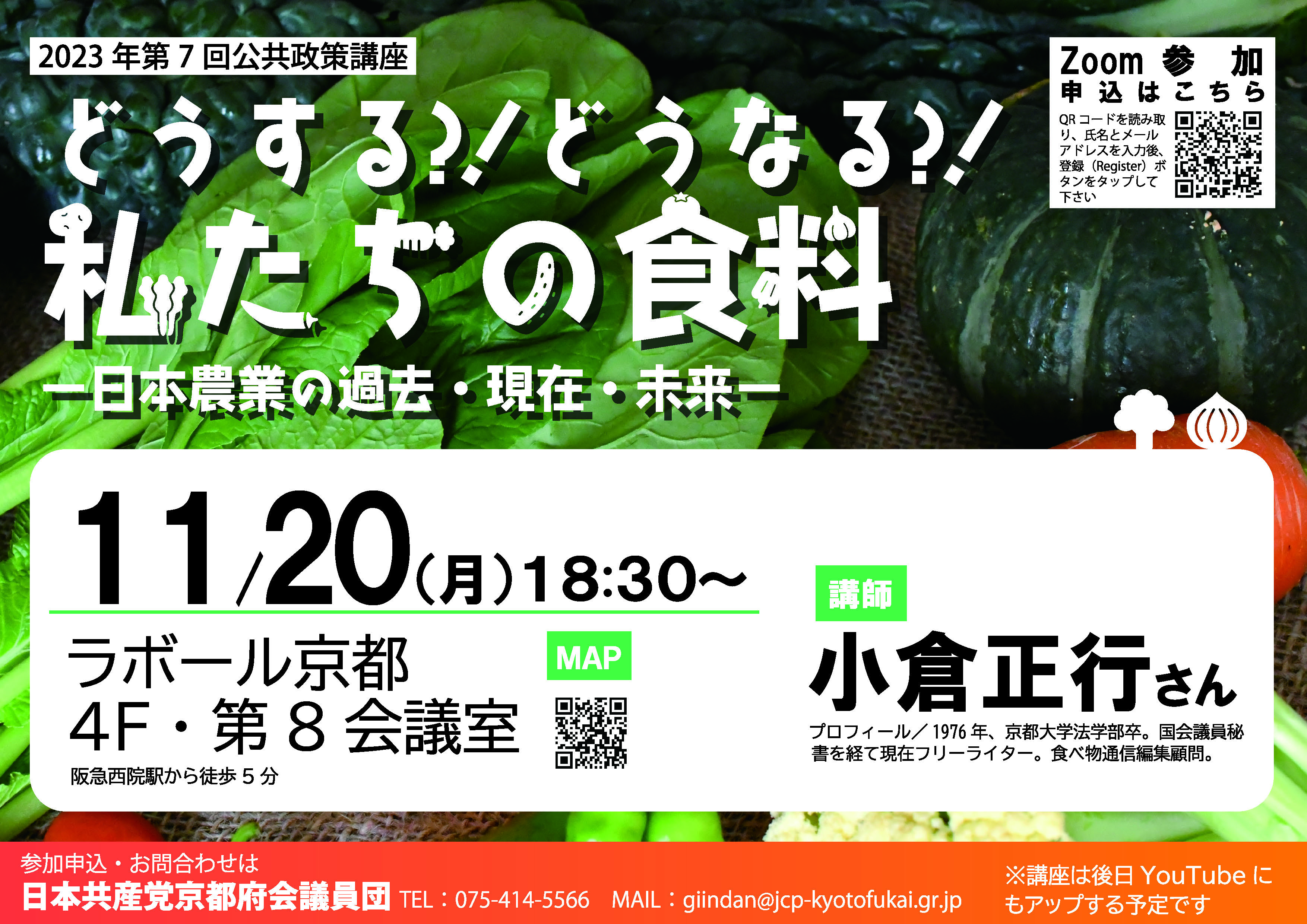 公共政策講座・第7弾「どうする!?どうなる!?私たちの食料-日本農業の過去・現在・未来-」【府会議員団】 💡zoom参加の方はこちらからお申込みください。➡https://us02web.zoom.us/meeting/register/tZcqde6vpj4jGtKIctrZ6rX_qYwUSr4seMQJ シェア ツイート 日時 11/20(月)18:30~20:00 場所 ラボール京都4F(第8会議室)