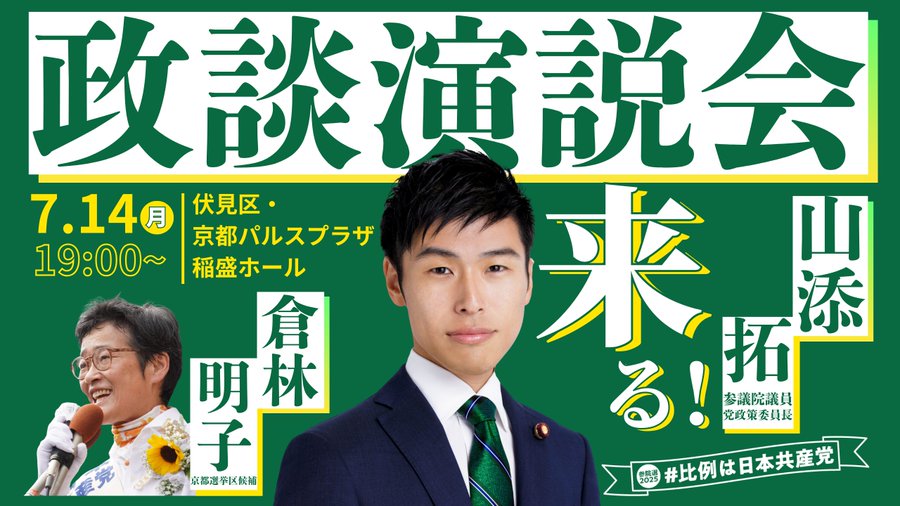 【伏見】日本共産党政談演説会 / 山添拓 来たる 山添拓・参議院議員・日本共産党政策委員長が来援! シェア ツイート 山添拓・参議院議員(党政策委員長) 倉林明子・京都選挙区候補 西山のぶひで・比例代表候補 日時 7/14(月)19:00~ 場所 京都パルスプラザ・稲盛ホール(京都市伏見区竹田鳥羽殿町5)
