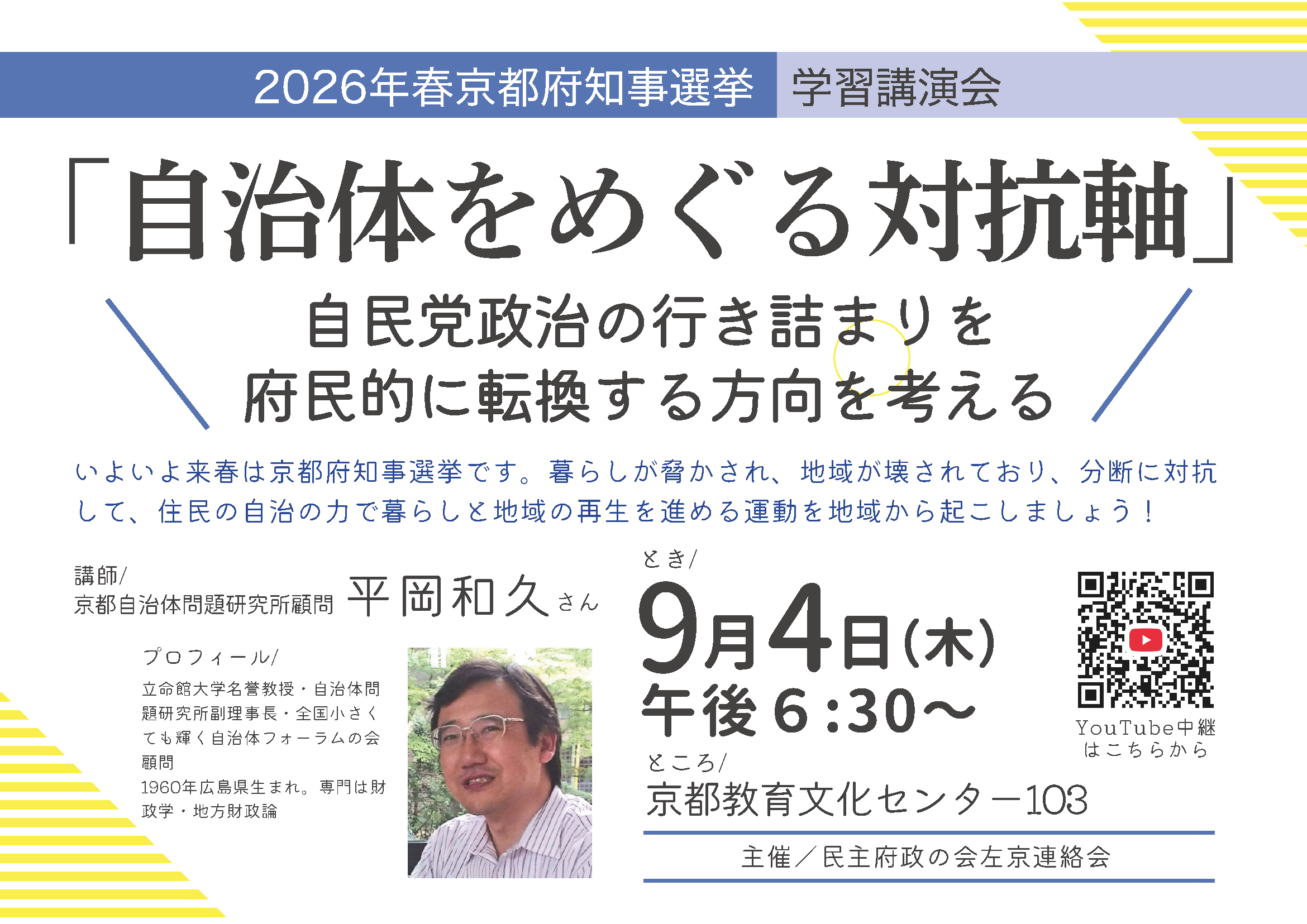 京都自治体問題研究所顧問・平岡和久さんを講師に、学習講演会を開催します。