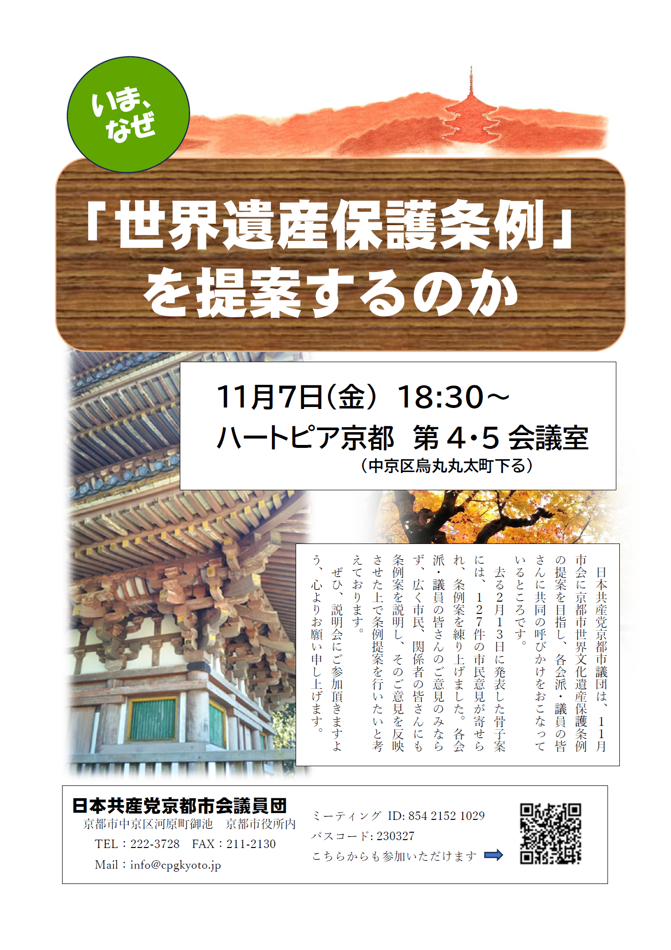 党議員団は、11月7日に「いま、なぜ『世界遺産保護条例』を提案するのか」(条例案に関する説明会)を開催します。