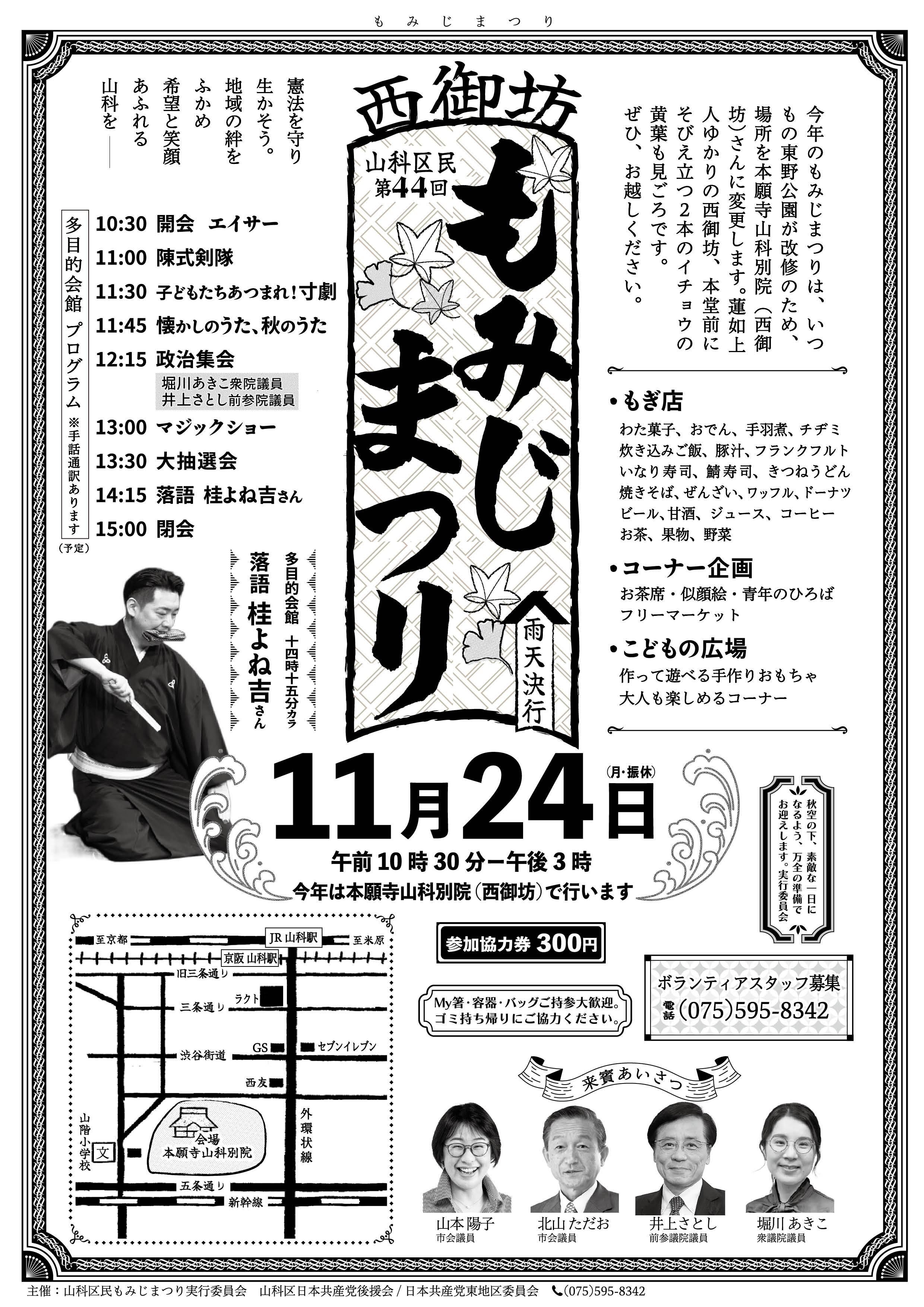 【山科】もみじまつり 憲法を守り活かそう 地域の絆をふかめ 希望と笑顔あふれる山科を 今年のもみじまつりは、いつもの東野公園が改修のため、場所を本願寺山科別院(西御坊)さんに変更します。 シェア ツイート 山本陽子 北山ただお 井上さとし 堀川あきこ 日時 11/24(月)10:00~15:00 場所 本願寺山科別院(西御坊)