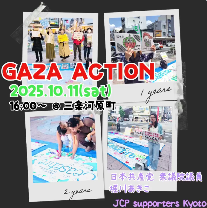 【JCPサポーター京都】GAZAアクション@三条河原町 各地で声が上がってます。 JCPサポーター京都は、今週も仲間たちと京都で声をあげます! ぜひご参加を!! 🕊️ガザアクション 🕊️10月11日(土)16:00〜 🕊️三条河原町 シェア ツイート 堀川あきこ衆議院議員 日時 10/11(土)16:00~ 場所 三条河原町
