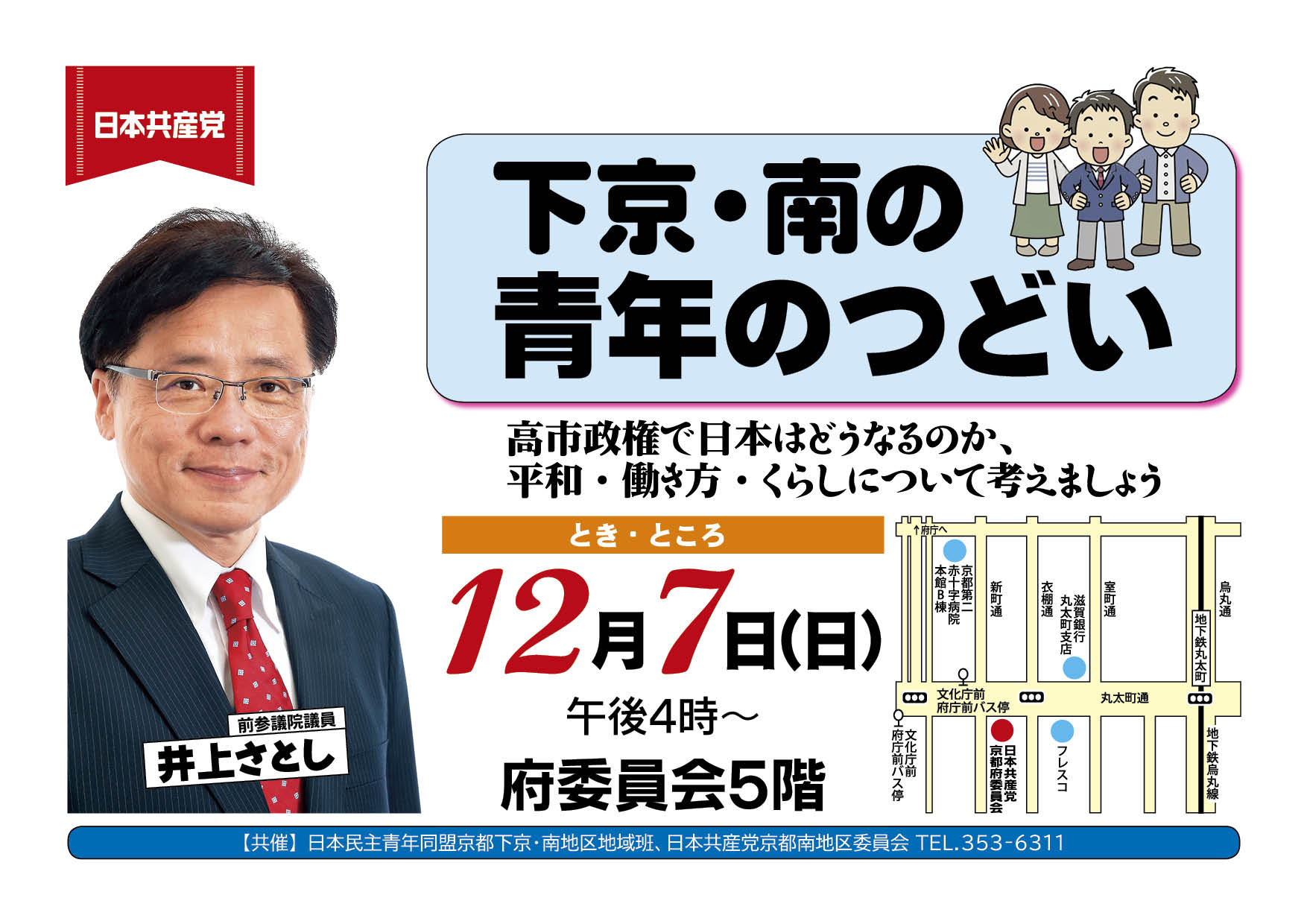 【下京・南区】下京・南の青年のつどい 高市政権で日本はどうなるのか、 平和・働き方・くらしについて考えましょう 【弁士】井上さとしさん(前参院議員) 【共催】 日本民主青年同盟京都下京・南地区地域班 日本共産党京都南地区委員会TEL.353-6311 シェア ツイート 井上さとし前参議院議員 日時 12/7(日)16:00~17:00 場所 府委員会5階