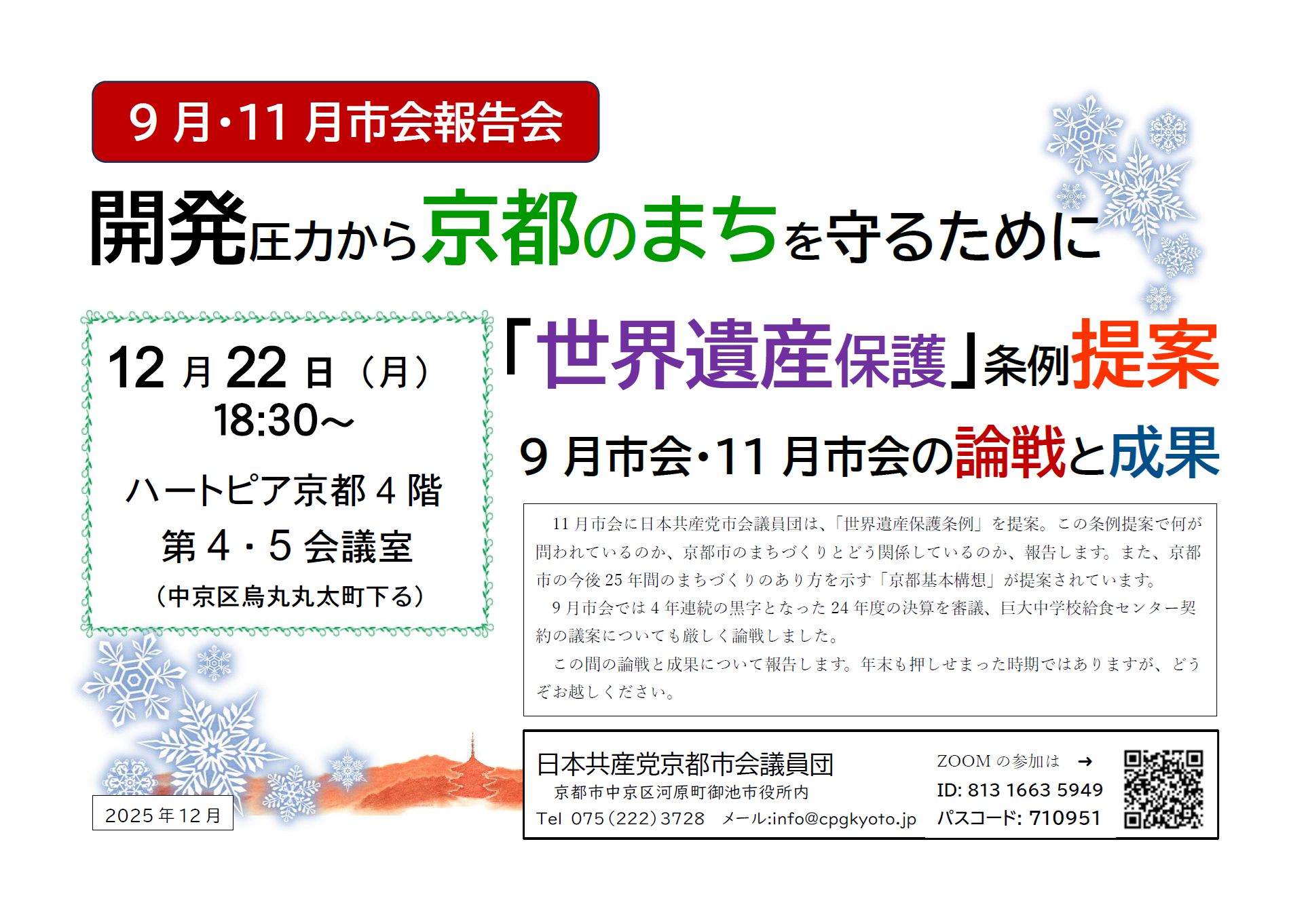 11月市会で党議員団は「世界遺産保護条例」を提案しました。また、京都市の今後25年間のありかたを示す「京都基本構想」が提案されています。「世界遺産保護条例」提案で問われていることやまちづくりの関係性、9月市会・11月市会の論戦と成果について報告いたします。