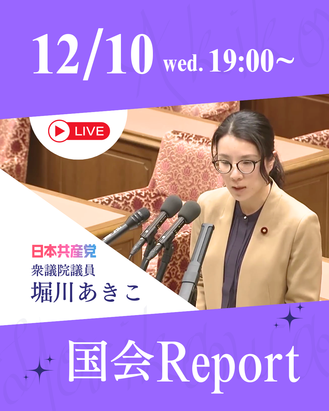 日本共産党・堀川あきこ衆議院議員が、激動の国会のリアルな様子を報告、焦点を解説します