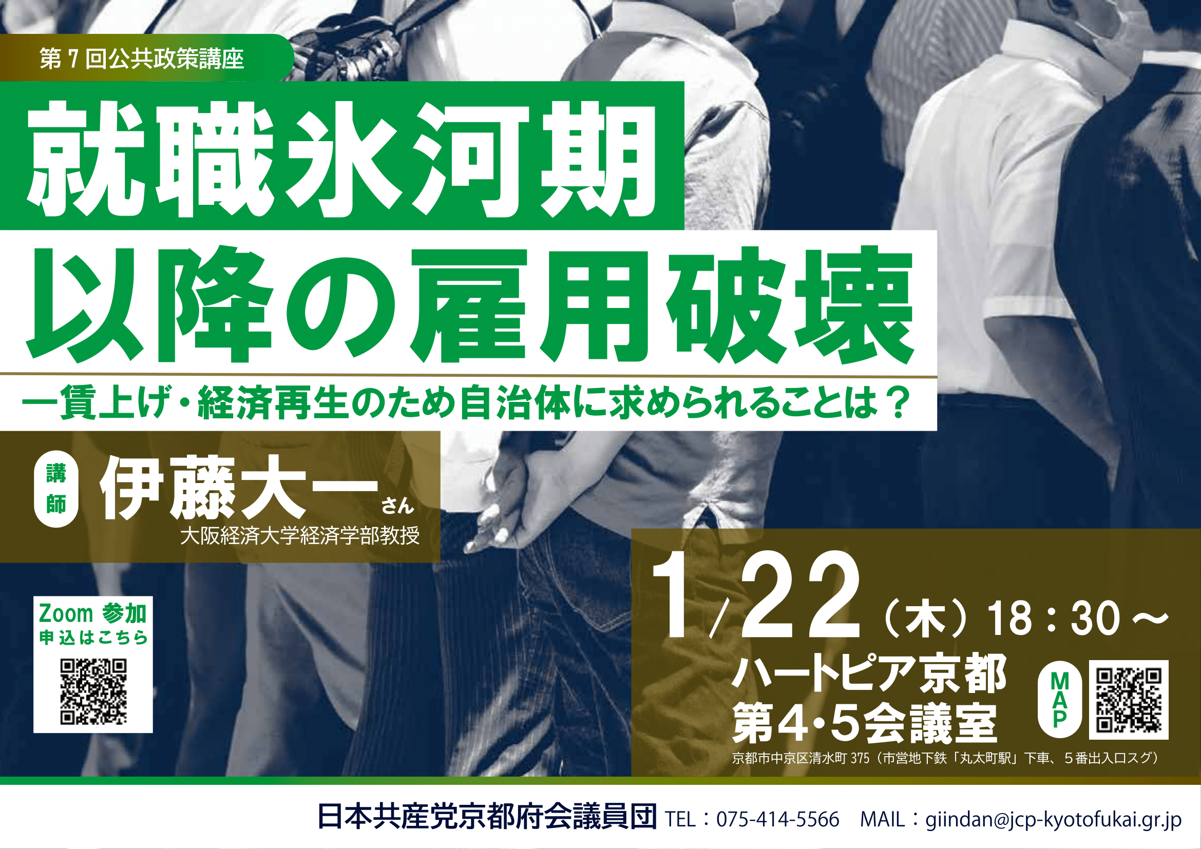 【府議団】「就職氷河期以降の雇用破壊」―賃上げ・経済再生のため自治体に求められることは? 💡zoomあります 申込みはこちらから➡【申込みフォーム】 第7回公共政策講座チラシ シェア ツイート 日時 1/22(木)18:30~ 場所 ハートピア京都 第4・第5会議室
