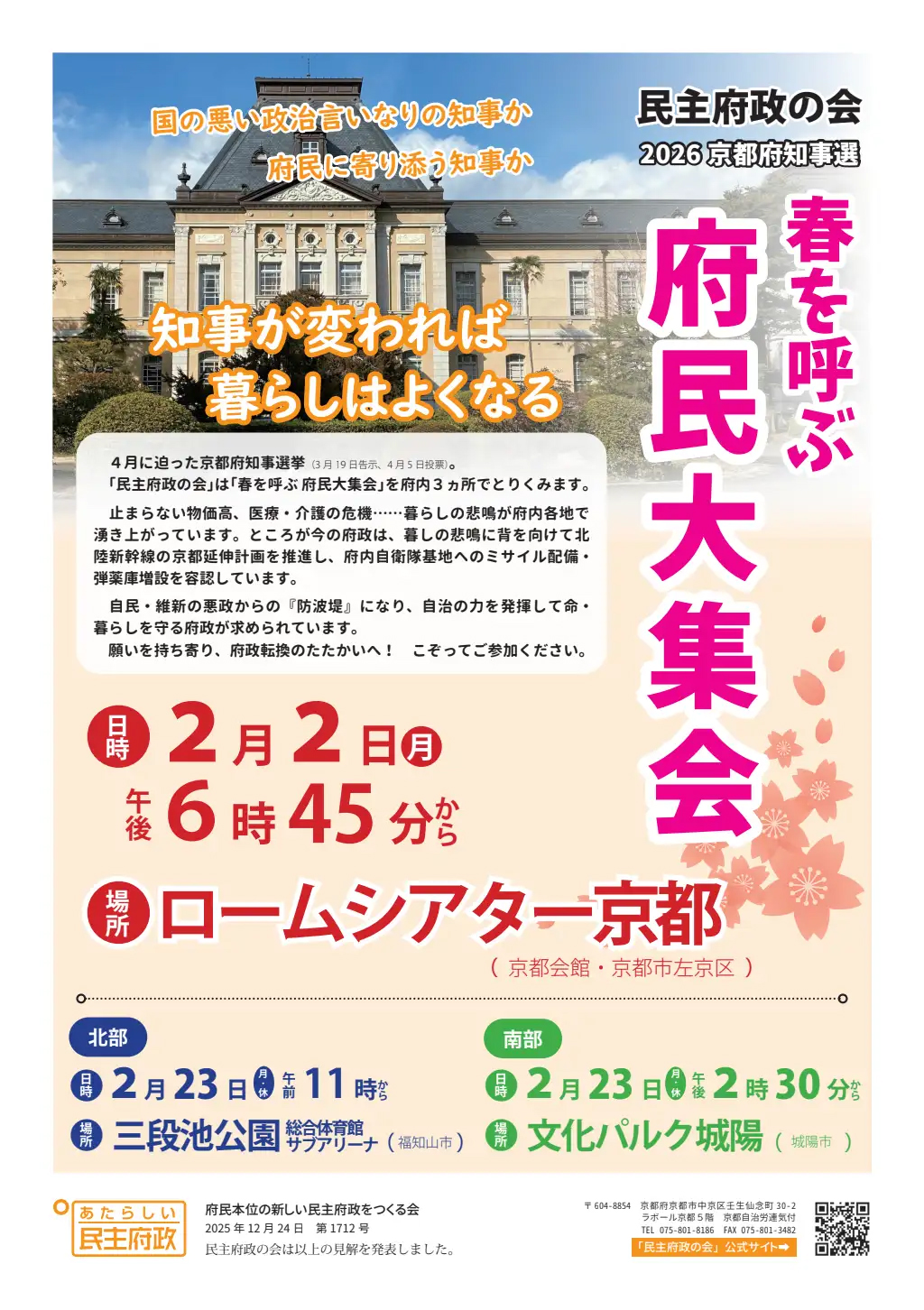 止まらない物価高、医療・介護の危機……暮らしの悲鳴が府内各地で湧き上がっています。ところが今の府政は、暮しの悲鳴に背を向けて北陸新幹線の京都延伸計画を推進し、府内自衛隊基地へのミサイル配備・弾薬庫増設を容認しています。
