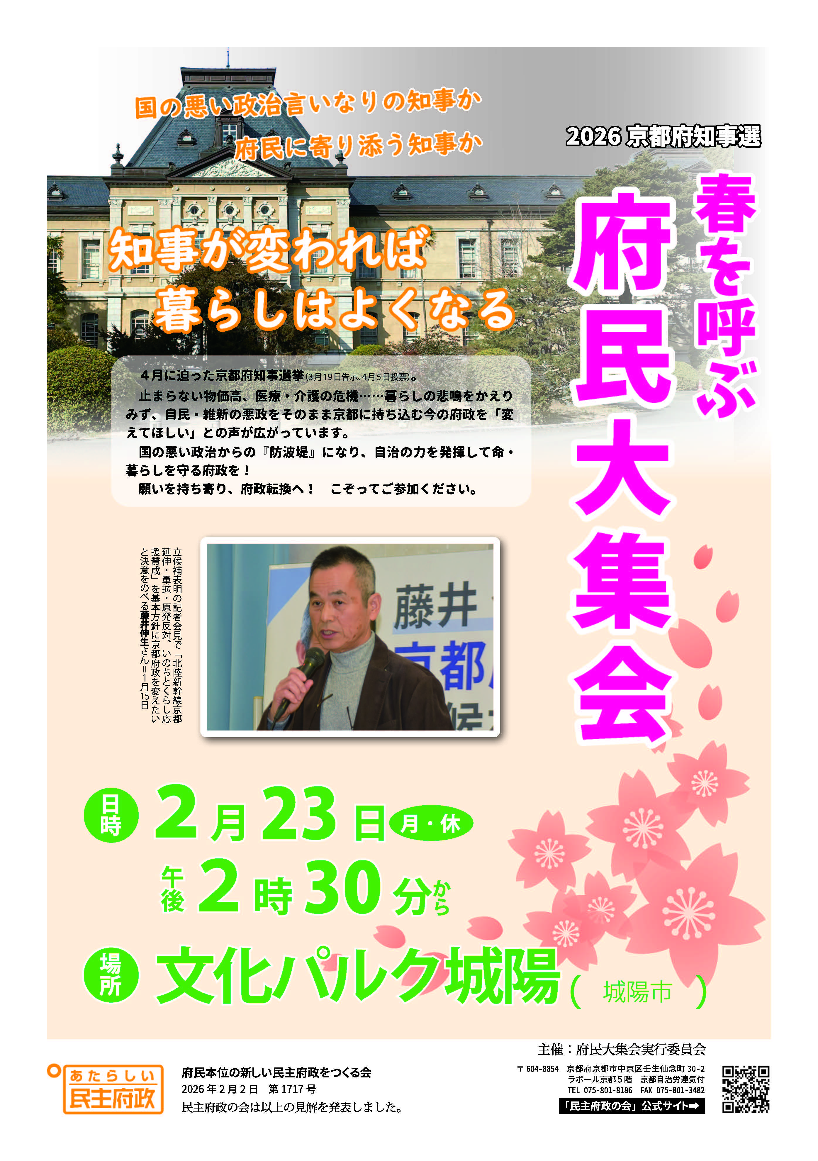 日本共産党も加わる「民主府政の会」が「春を呼ぶ府民大集会 南部集会」を開催します。