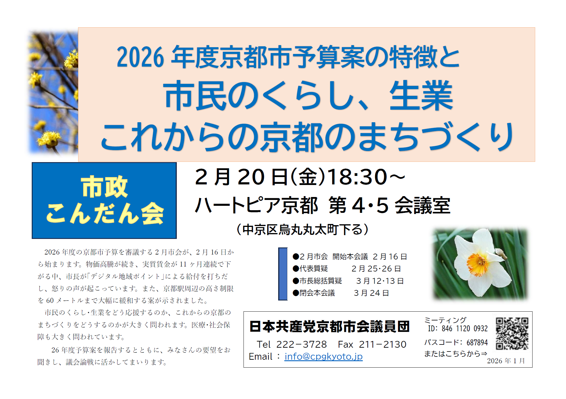 【京都市議団】市政こんだん会―2026年度京都市予算案の特徴と市民のくらし、生業、これからの京都のまちづくり