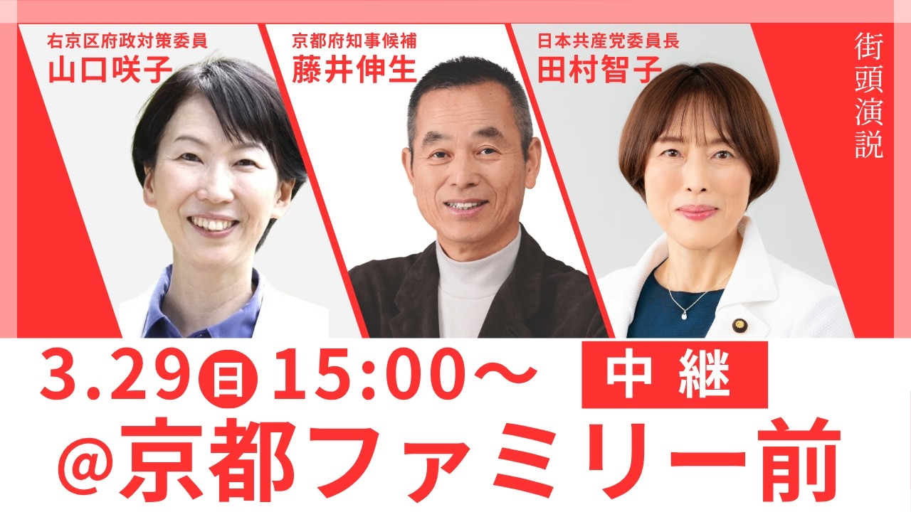 府議補選(4月5日投票)で投票日前最後の日曜日となる29日、 日本共産党の田村智子委員長が京都に駆け付け、街頭から支援を訴えます。